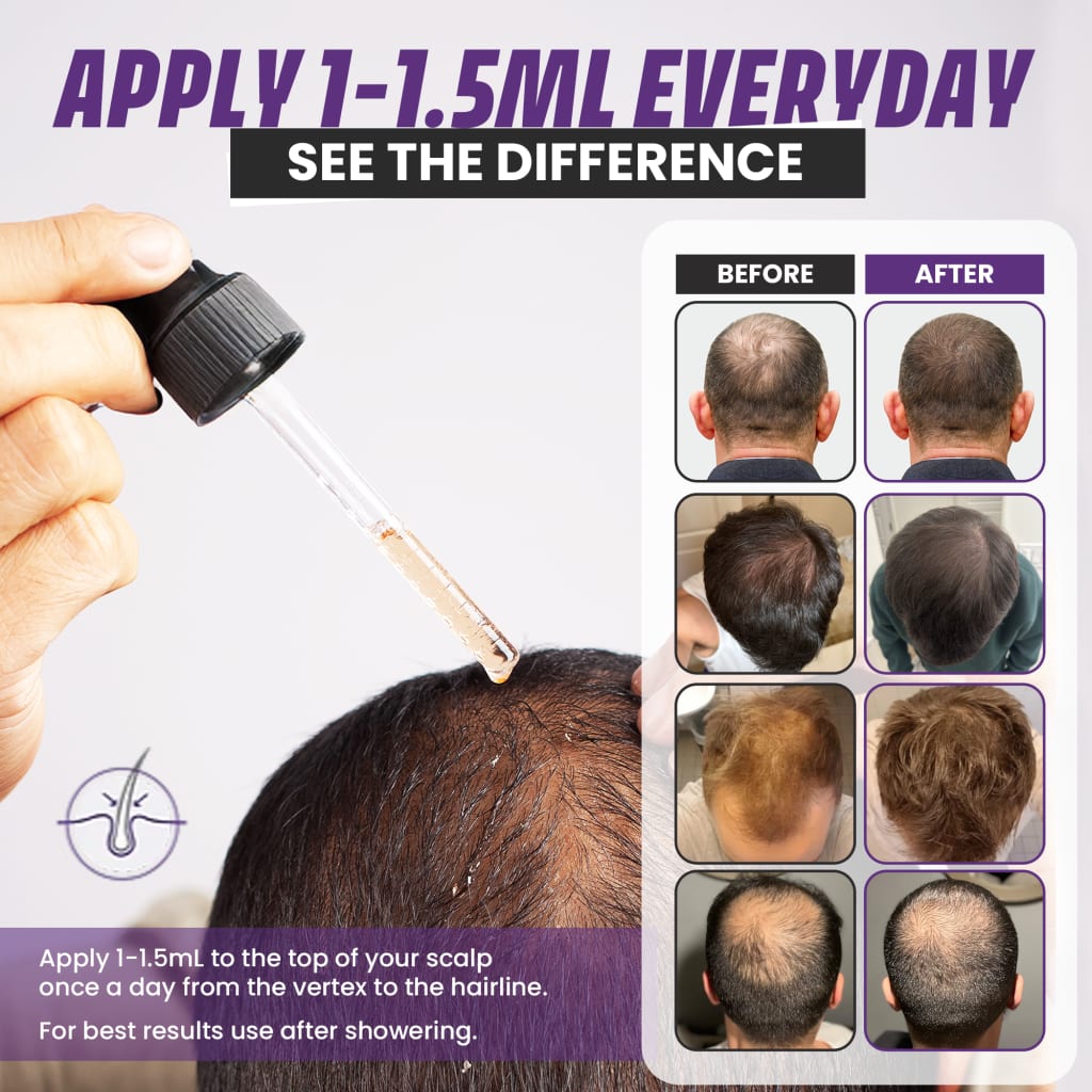 Formulated in a lightweight alcohol base, our serum glides onto your scalp without greasy residue. Enjoy a fresh, tingle-free application that absorbs in seconds. Integrate effortlessly into your daily routine—apply morning and night to wake up revitalized hair follicles ready to grow.